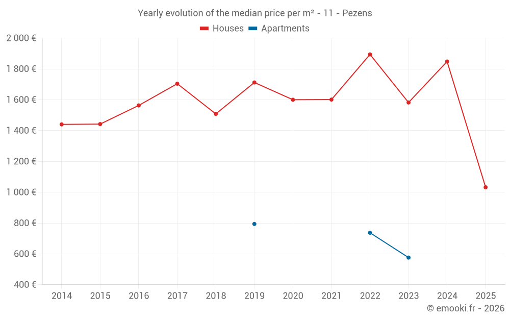 The median price on the 34 house transactions of the last 24 months in the municipality of Pezens was 1 848 € per square meter for a median property value of 163 865 €. Over this period, 60% of transactions were between 905 and 2 235 € per square meter (from the 2nd to the 8th deciles).