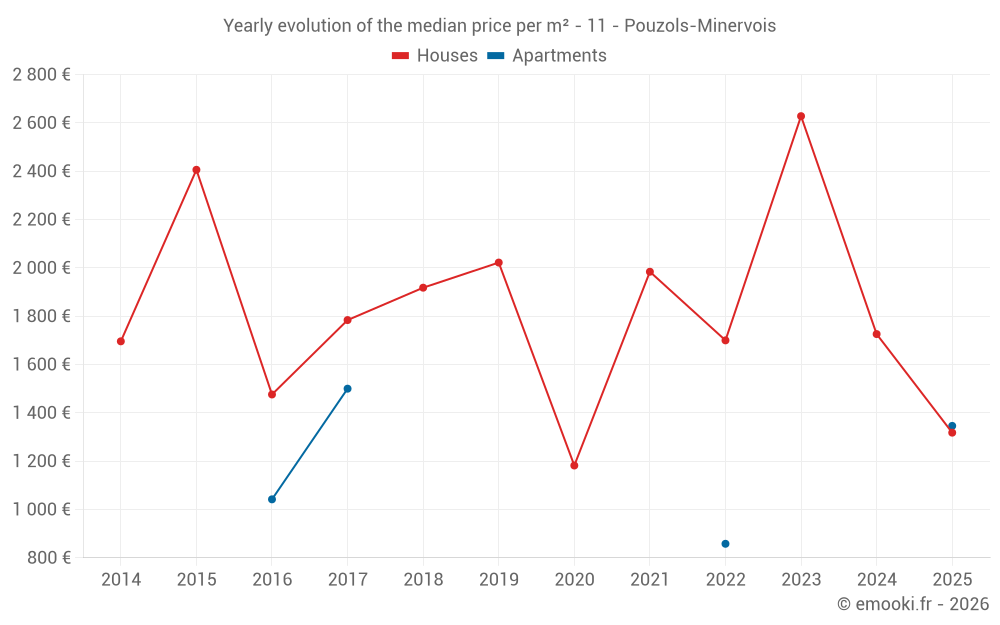 The median price on the 27 house transactions of the last 24 months in the municipality of Pouzols-Minervois was 2 223 € per square meter for a median property value of 229 000 €. Over this period, 60% of transactions were between 786 and 2 749 € per square meter (from the 2nd to the 8th deciles).