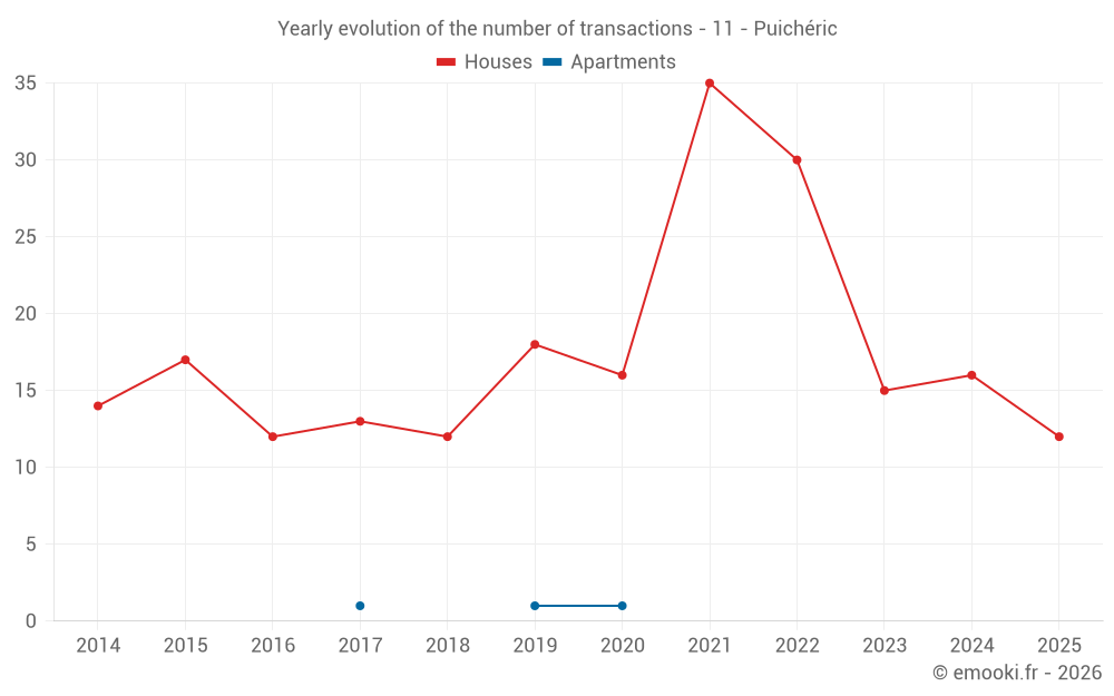 The median price on the 21 house transactions of the last 12 months in the municipality of Puichéric was 1 000 € per square meter for a median property value of 72 000 €. Over this period, 60% of transactions were between 563 and 1 953 € per square meter (from the 2nd to the 8th deciles).