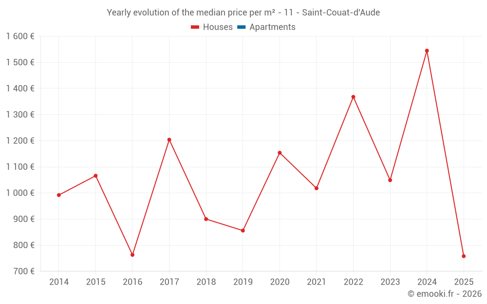 The median price on the 14 house transactions of the last 24 months in the municipality of Saint-Couat-d'Aude was 1 200 € per square meter for a median property value of 113 000 €. Over this period, 60% of transactions were between 724 and 1 983 € per square meter (from the 2nd to the 8th deciles).