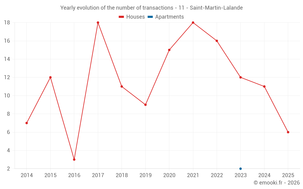 The median price on the 22 house transactions of the last 24 months in the municipality of Saint-Martin-Lalande was 1 911 € per square meter for a median property value of 189 500 €. Over this period, 60% of transactions were between 958 and 2 266 € per square meter (from the 2nd to the 8th deciles).