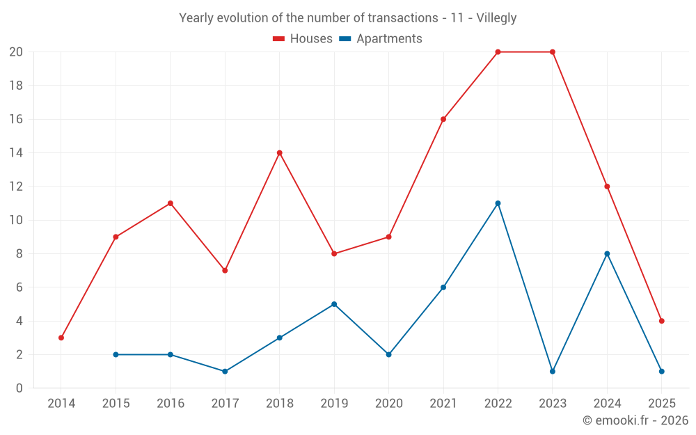 The median price on the 25 house transactions of the last 24 months in the municipality of Villegly was 1 625 € per square meter for a median property value of 173 315 €. Over this period, 60% of transactions were between 1 089 and 2 211 € per square meter (from the 2nd to the 8th deciles).