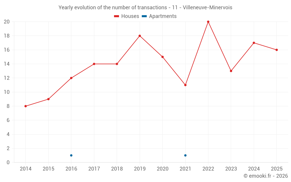 The median price on the 16 house transactions of the last 12 months in the municipality of Villeneuve-Minervois was 1 288 € per square meter for a median property value of 113 000 €. Over this period, 60% of transactions were between 1 074 and 1 909 € per square meter (from the 2nd to the 8th deciles).