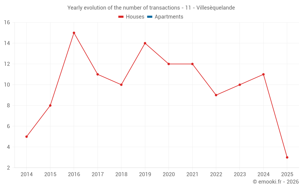 The median price on the 18 house transactions of the last 24 months in the municipality of Villesèquelande was 1 699 € per square meter for a median property value of 154 600 €. Over this period, 60% of transactions were between 1 303 and 2 097 € per square meter (from the 2nd to the 8th deciles).