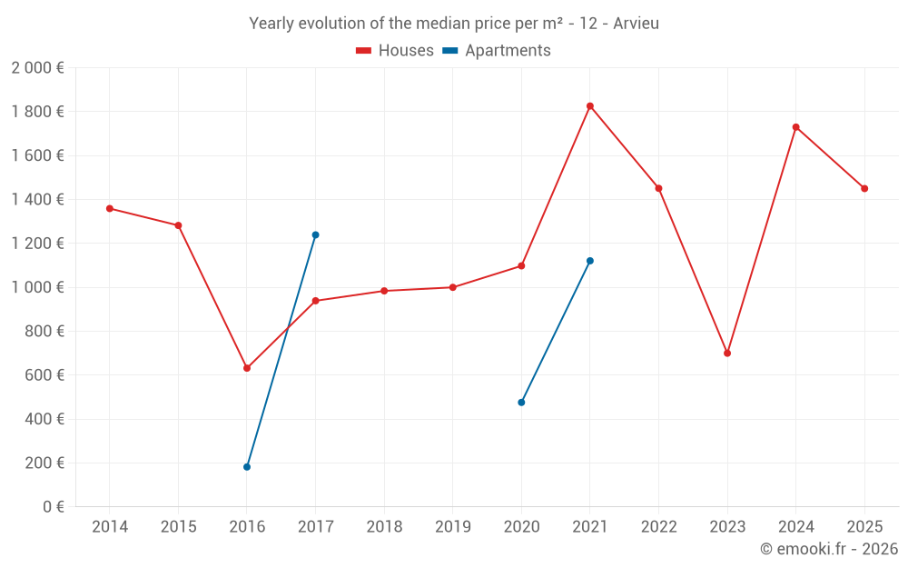 The median price on the 15 house transactions of the last 24 months in the municipality of Arvieu was 1 400 € per square meter for a median property value of 150 000 €. Over this period, 60% of transactions were between 1 026 and 2 640 € per square meter (from the 2nd to the 8th deciles).