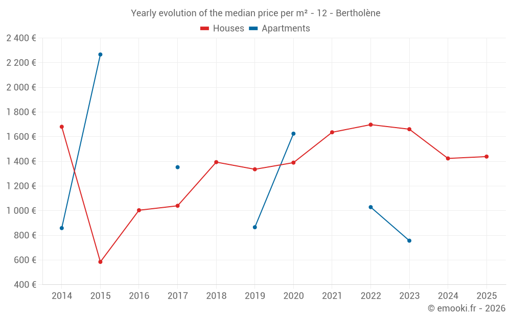 The median price on the 22 house transactions of the last 24 months in the municipality of Bertholène was 1 352 € per square meter for a median property value of 156 500 €. Over this period, 60% of transactions were between 776 and 1 773 € per square meter (from the 2nd to the 8th deciles).
