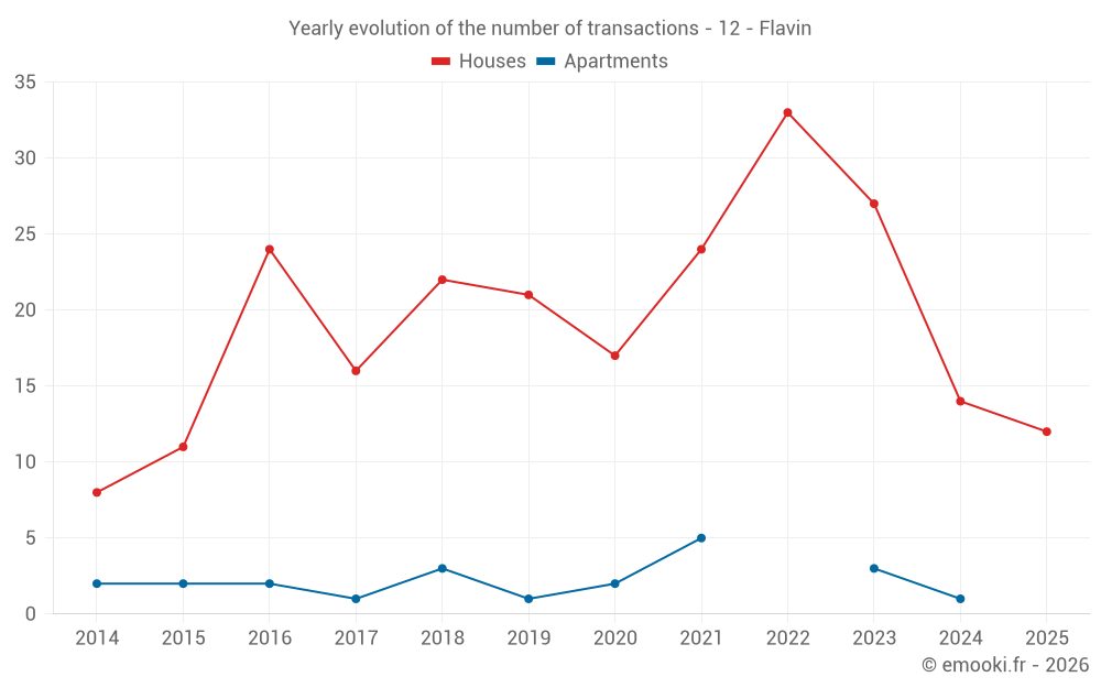 The median price on the 19 house transactions of the last 12 months in the municipality of Flavin was 1 408 € per square meter for a median property value of 132 200 €. Over this period, 60% of transactions were between 746 and 2 455 € per square meter (from the 2nd to the 8th deciles).