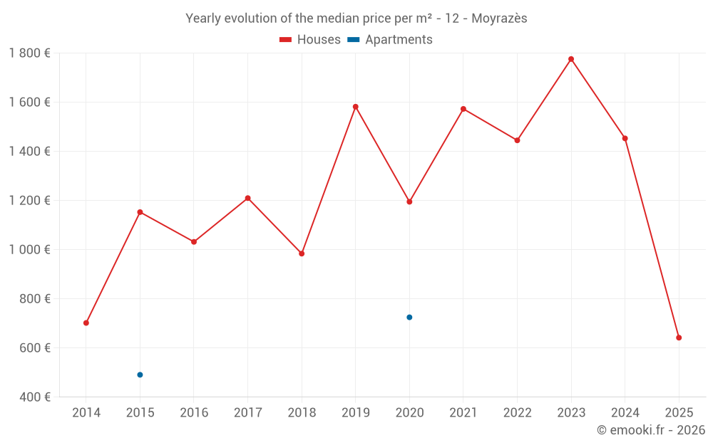 The median price on the 26 house transactions of the last 24 months in the municipality of Moyrazès was 1 406 € per square meter for a median property value of 145 865 €. Over this period, 60% of transactions were between 595 and 2 322 € per square meter (from the 2nd to the 8th deciles).
