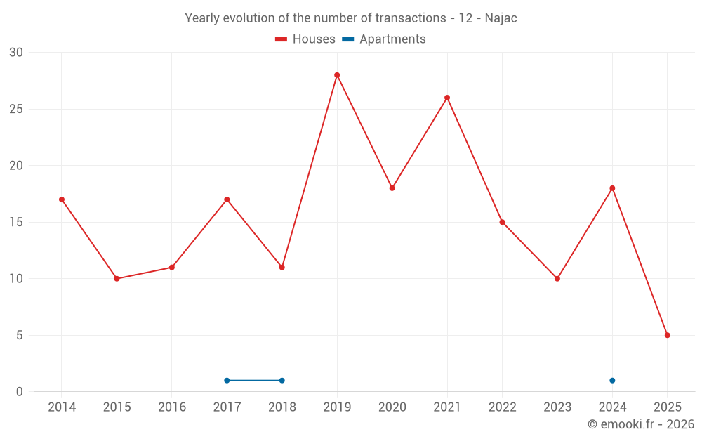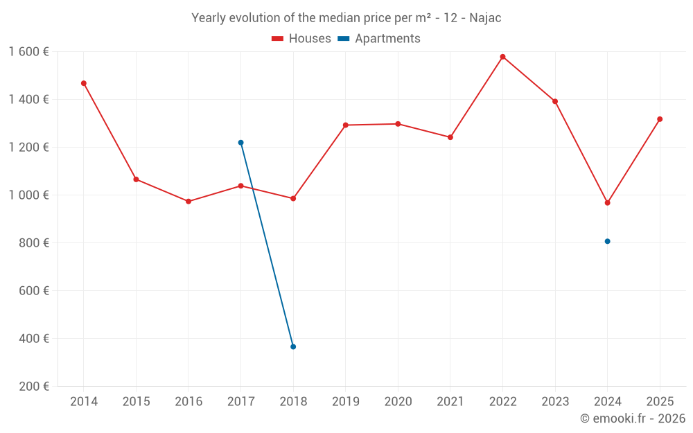 The median price on the 16 house transactions of the last 12 months in the municipality of Najac was 1 172 € per square meter for a median property value of 124 650 €. Over this period, 60% of transactions were between 717 and 2 203 € per square meter (from the 2nd to the 8th deciles).