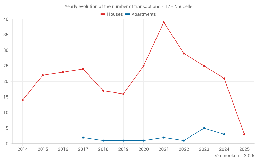 The median price on the 37 house transactions of the last 24 months in the municipality of Naucelle was 1 531 € per square meter for a median property value of 162 850 €. Over this period, 60% of transactions were between 1 095 and 2 030 € per square meter (from the 2nd to the 8th deciles).