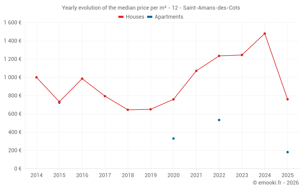 The price per m² of houses has decreased by 49% since 1 year, but it has increased by 17% in 6 years.