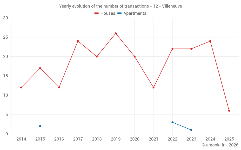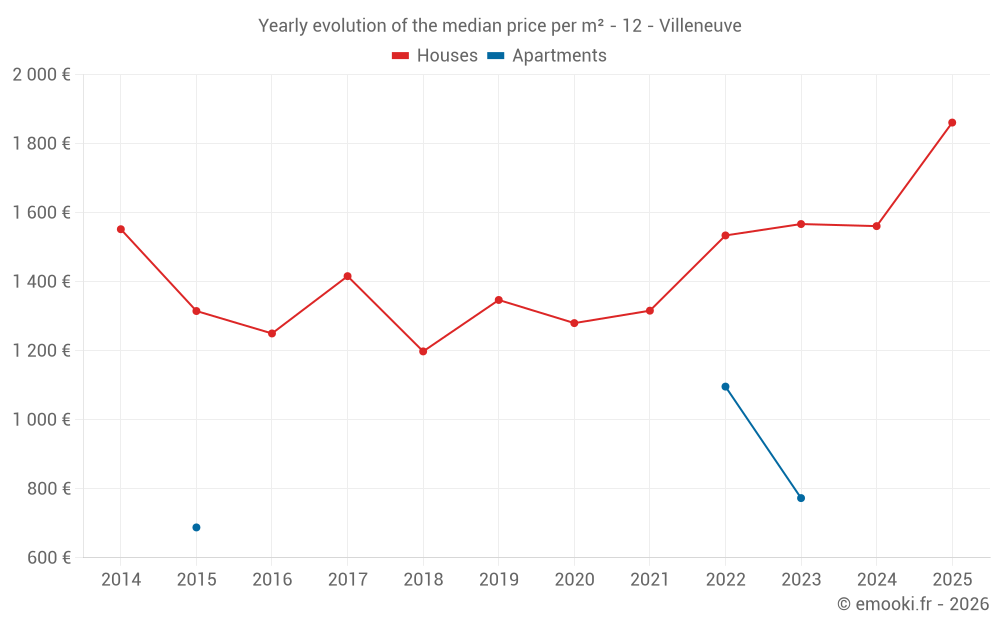 The median price on the 18 house transactions of the last 12 months in the municipality of Villeneuve was 1 736 € per square meter for a median property value of 187 500 €. Over this period, 60% of transactions were between 1 151 and 1 930 € per square meter (from the 2nd to the 8th deciles).