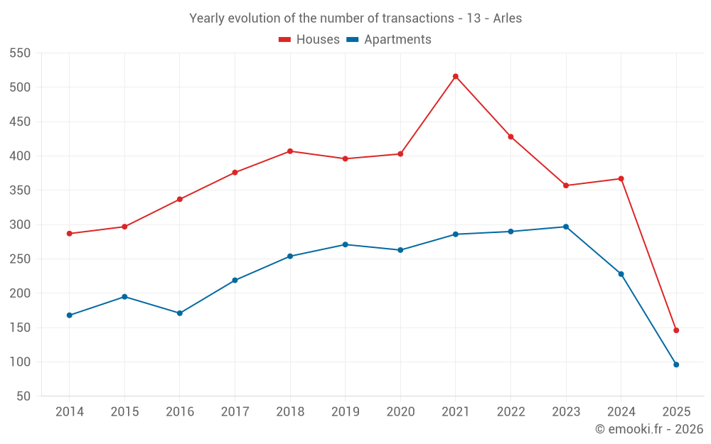 The median price on the 66 house transactions of the last 3 months in the municipality of Arles was 2 786 € per square meter for a median property value of 261 500 €. Over this period, 60% of transactions were between 2 101 and 3 850 € per square meter (from the 2nd to the 8th deciles).