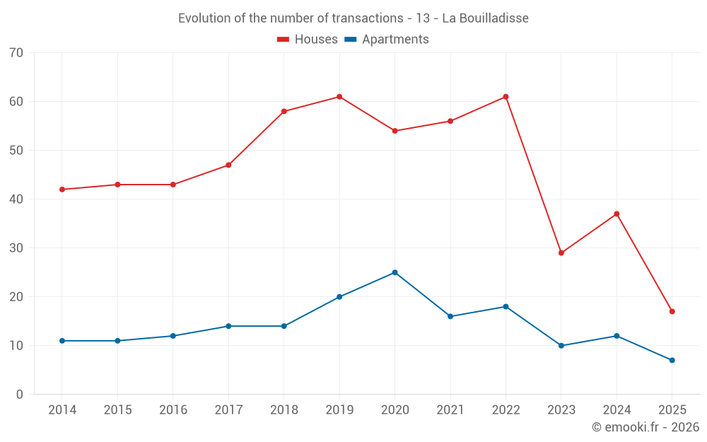 The median price on the 23 apartment transactions of the last 24 months in the municipality of La Bouilladisse was 3 365 € per square meter for a median property value of 220 000 €. Over this period, 60% of transactions were between 2 161 and 4 194 € per square meter (from the 2nd to the 8th deciles).