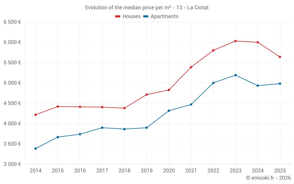 The median price on the 27 house transactions of the last 3 months in the municipality of La Ciotat was 5 019 € per square meter for a median property value of 590 000 €. Over this period, 60% of transactions were between 3 303 and 6 633 € per square meter (from the 2nd to the 8th deciles).