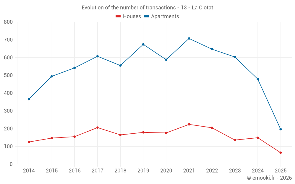 The median price on the 90 apartment transactions of the last 3 months in the municipality of La Ciotat was 4 950 € per square meter for a median property value of 245 000 €. Over this period, 60% of transactions were between 3 623 and 6 530 € per square meter (from the 2nd to the 8th deciles).