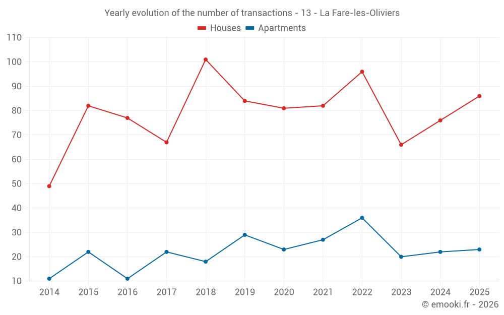 The median price on the 49 house transactions of the last 6 months in the municipality of La Fare-les-Oliviers was 4 217 € per square meter for a median property value of 339 400 €. Over this period, 60% of transactions were between 3 268 and 4 872 € per square meter (from the 2nd to the 8th deciles).
