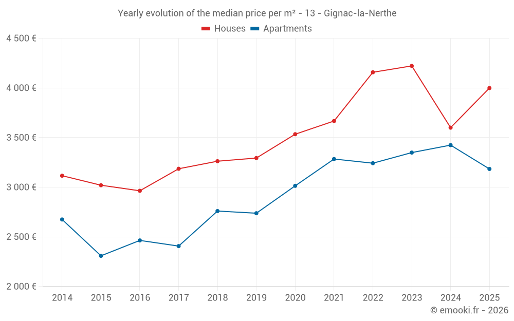 The median price on the 18 apartment transactions of the last 12 months in the municipality of Gignac-la-Nerthe was 3 214 € per square meter for a median property value of 229 650 €. Over this period, 60% of transactions were between 2 627 and 3 677 € per square meter (from the 2nd to the 8th deciles).