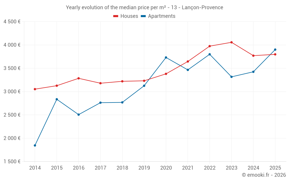 The median price on the 30 apartment transactions of the last 12 months in the municipality of Lançon-Provence was 3 900 € per square meter for a median property value of 214 700 €. Over this period, 60% of transactions were between 3 561 and 4 373 € per square meter (from the 2nd to the 8th deciles).