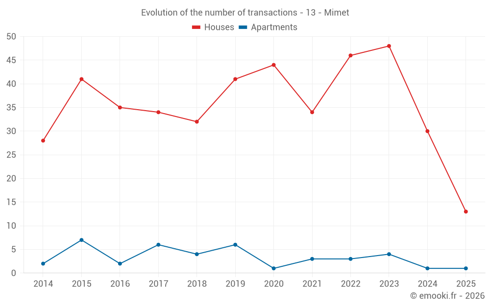 The median price on the 34 house transactions of the last 12 months in the municipality of Mimet was 4 994 € per square meter for a median property value of 511 405 €. Over this period, 60% of transactions were between 4 060 and 5 728 € per square meter (from the 2nd to the 8th deciles).