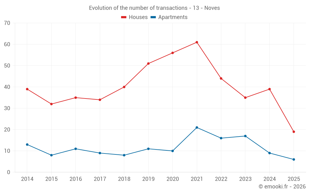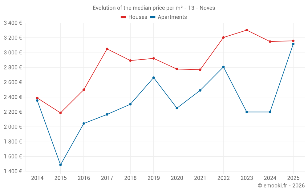 The median price on the 19 house transactions of the last 6 months in the municipality of Noves was 3 159 € per square meter for a median property value of 383 500 €. Over this period, 60% of transactions were between 2 228 and 5 066 € per square meter (from the 2nd to the 8th deciles).