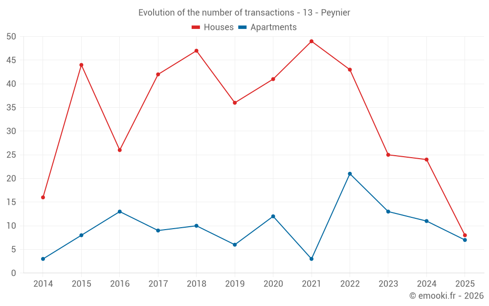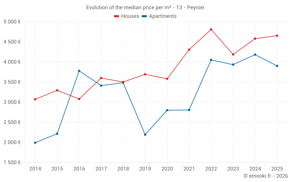 The median price on the 19 house transactions of the last 12 months in the municipality of Peynier was 4 621 € per square meter for a median property value of 402 220 €. Over this period, 60% of transactions were between 3 611 and 5 216 € per square meter (from the 2nd to the 8th deciles).