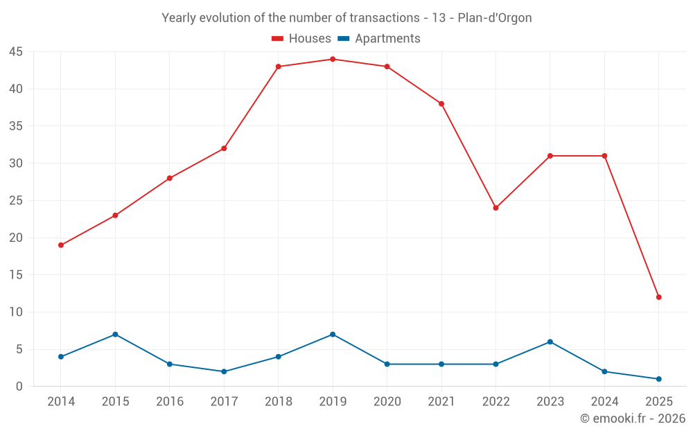 The median price on the 26 house transactions of the last 12 months in the municipality of Plan-d'Orgon was 2 574 € per square meter for a median property value of 289 500 €. Over this period, 60% of transactions were between 1 950 and 3 200 € per square meter (from the 2nd to the 8th deciles).