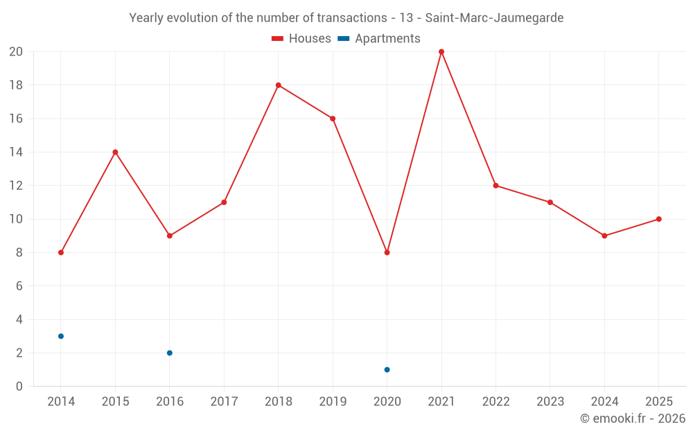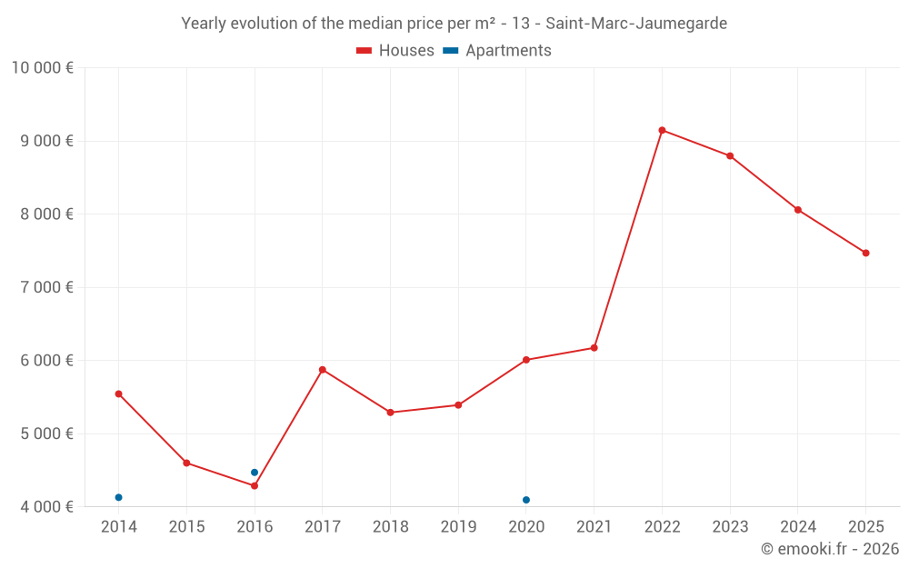 The median price on the 27 house transactions of the last 24 months in the municipality of Saint-Marc-Jaumegarde was 7 531 € per square meter for a median property value of 1 349 462 €. Over this period, 60% of transactions were between 5 255 and 10 192 € per square meter (from the 2nd to the 8th deciles).