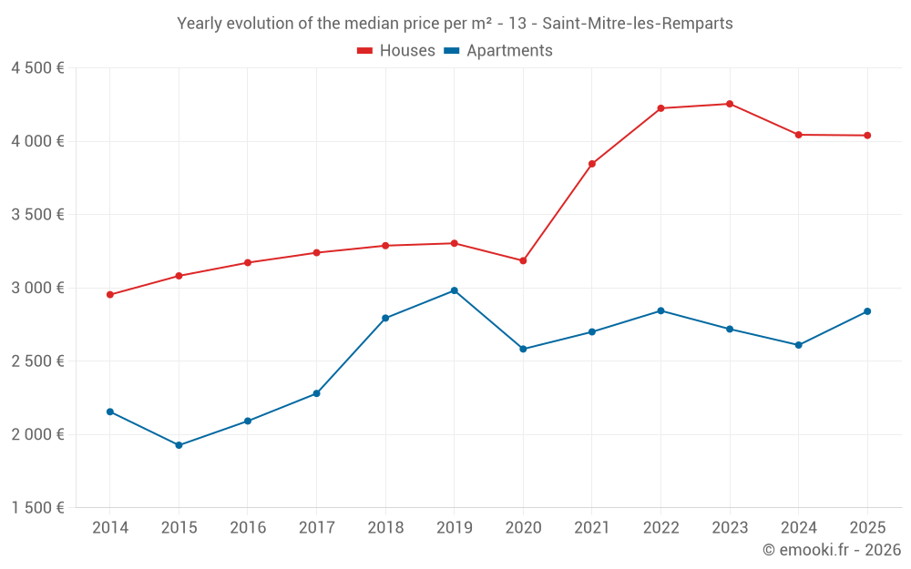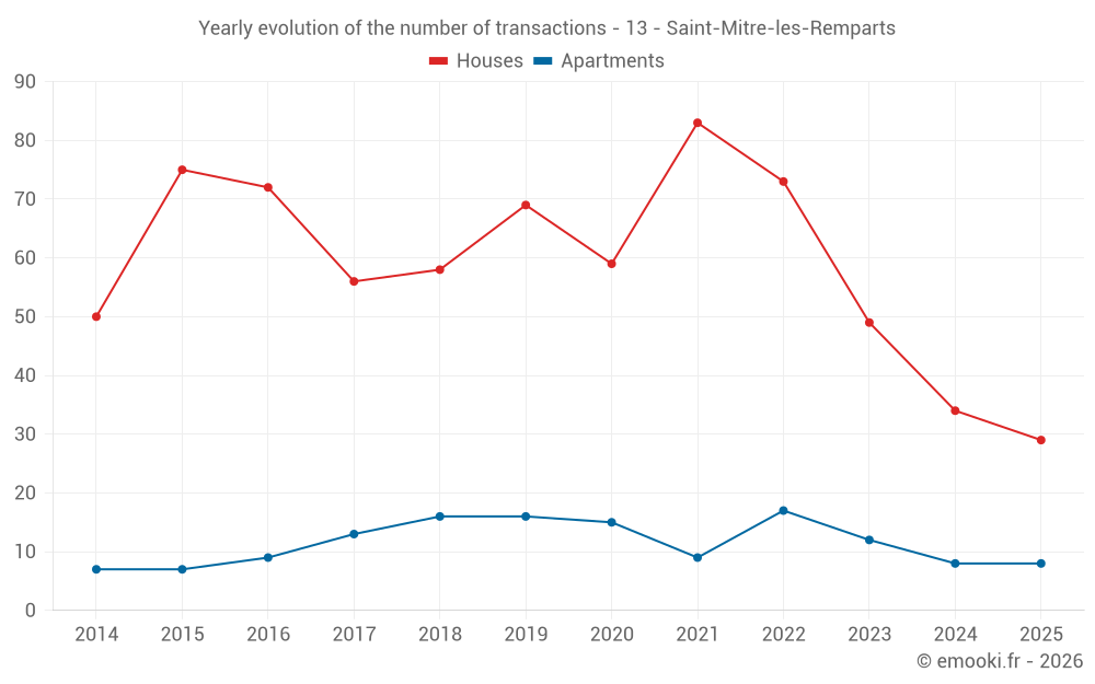 The median price on the 29 house transactions of the last 6 months in the municipality of Saint-Mitre-les-Remparts was 4 040 € per square meter for a median property value of 285 000 €. Over this period, 60% of transactions were between 3 222 and 4 734 € per square meter (from the 2nd to the 8th deciles).