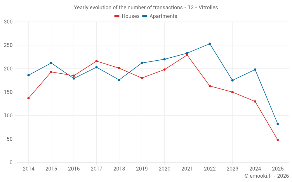 The median price on the 48 house transactions of the last 6 months in the municipality of Vitrolles was 3 924 € per square meter for a median property value of 322 616 €. Over this period, 60% of transactions were between 3 031 and 4 457 € per square meter (from the 2nd to the 8th deciles).