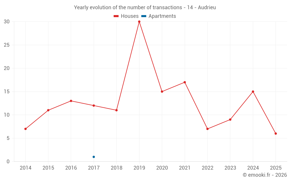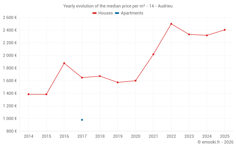 The median price on the 17 house transactions of the last 12 months in the municipality of Audrieu was 2 398 € per square meter for a median property value of 243 200 €. Over this period, 60% of transactions were between 2 184 and 2 582 € per square meter (from the 2nd to the 8th deciles).