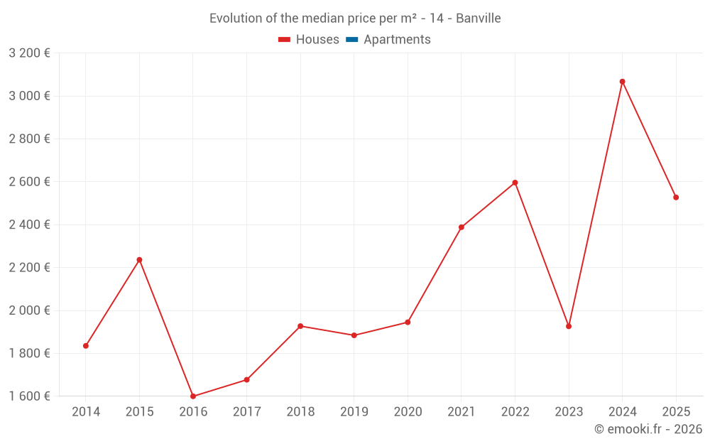 The median price on the 17 house transactions of the last 24 months in the municipality of Banville was 2 527 € per square meter for a median property value of 248 500 €. Over this period, 60% of transactions were between 1 621 and 3 178 € per square meter (from the 2nd to the 8th deciles).