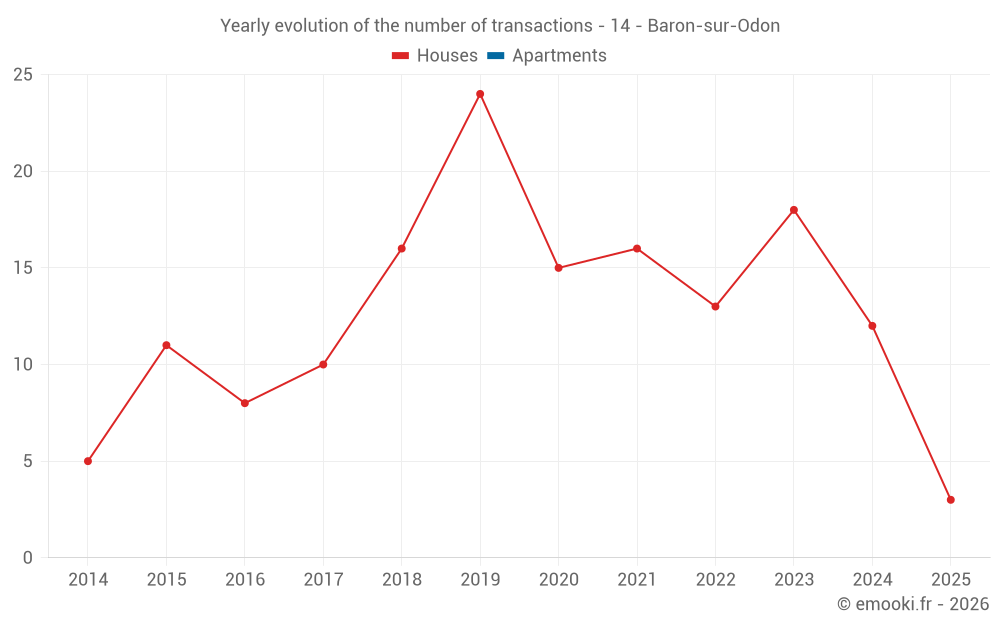 The median price on the 22 house transactions of the last 24 months in the municipality of Baron-sur-Odon was 2 756 € per square meter for a median property value of 269 000 €. Over this period, 60% of transactions were between 2 081 and 3 002 € per square meter (from the 2nd to the 8th deciles).