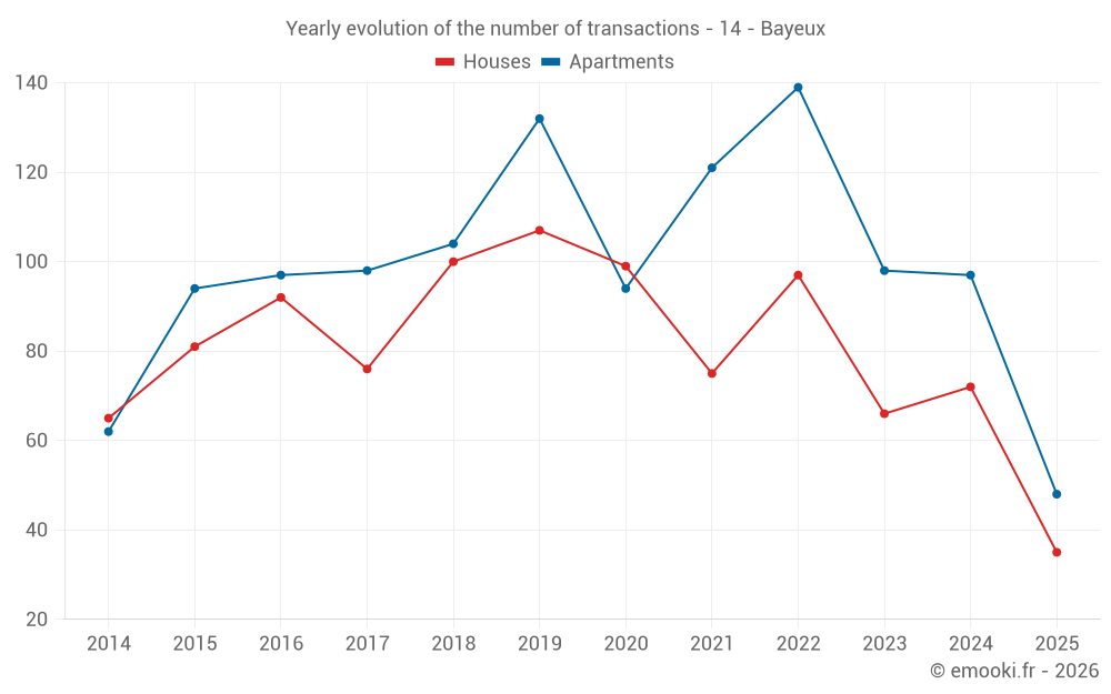The median price on the 20 apartment transactions of the last 3 months in the municipality of Bayeux was 2 276 € per square meter for a median property value of 153 050 €. Over this period, 60% of transactions were between 1 875 and 2 794 € per square meter (from the 2nd to the 8th deciles).