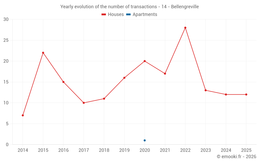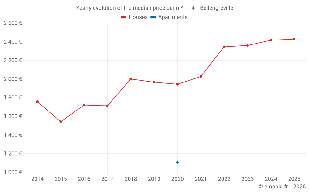 The median price on the 23 house transactions of the last 12 months in the municipality of Bellengreville was 2 418 € per square meter for a median property value of 210 400 €. Over this period, 60% of transactions were between 1 963 and 2 856 € per square meter (from the 2nd to the 8th deciles).