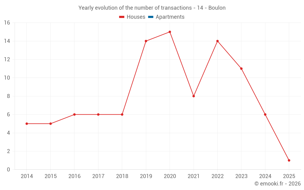 The median price on the 14 house transactions of the last 24 months in the municipality of Boulon was 1 900 € per square meter for a median property value of 238 000 €. Over this period, 60% of transactions were between 1 518 and 2 095 € per square meter (from the 2nd to the 8th deciles).