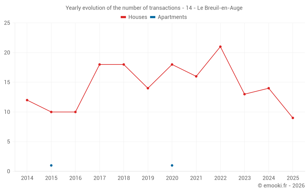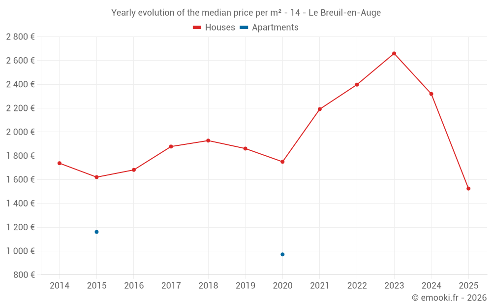 The median price on the 18 house transactions of the last 12 months in the municipality of Le Breuil-en-Auge was 1 865 € per square meter for a median property value of 201 000 €. Over this period, 60% of transactions were between 1 422 and 2 761 € per square meter (from the 2nd to the 8th deciles).