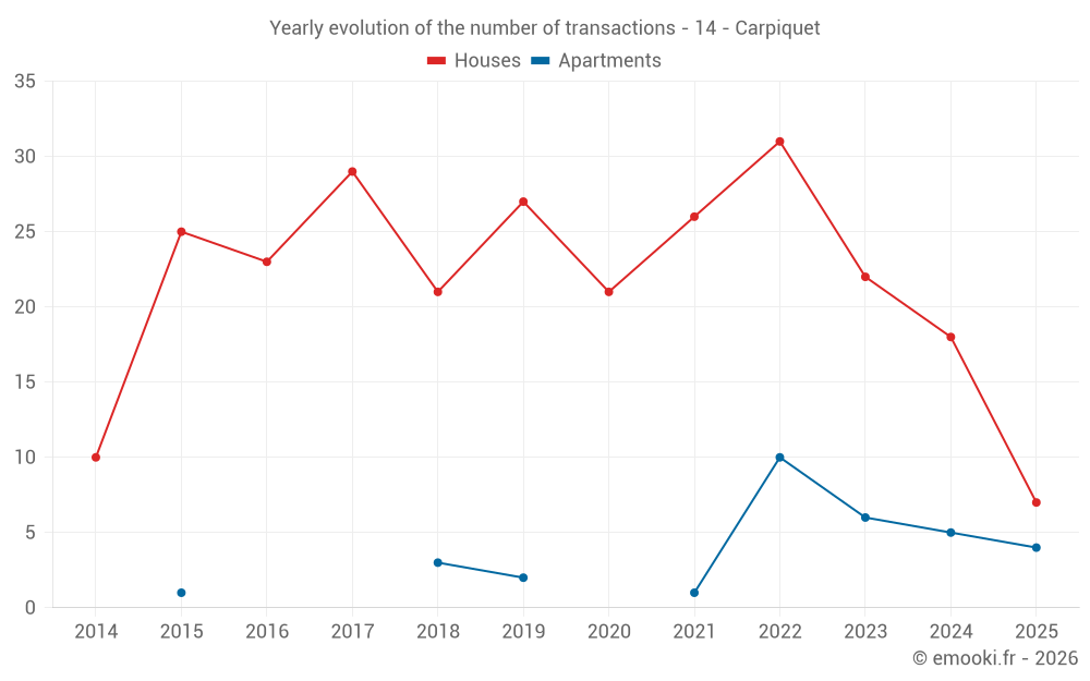 The median price on the 38 house transactions of the last 24 months in the municipality of Carpiquet was 2 826 € per square meter for a median property value of 245 625 €. Over this period, 60% of transactions were between 2 195 and 3 213 € per square meter (from the 2nd to the 8th deciles).