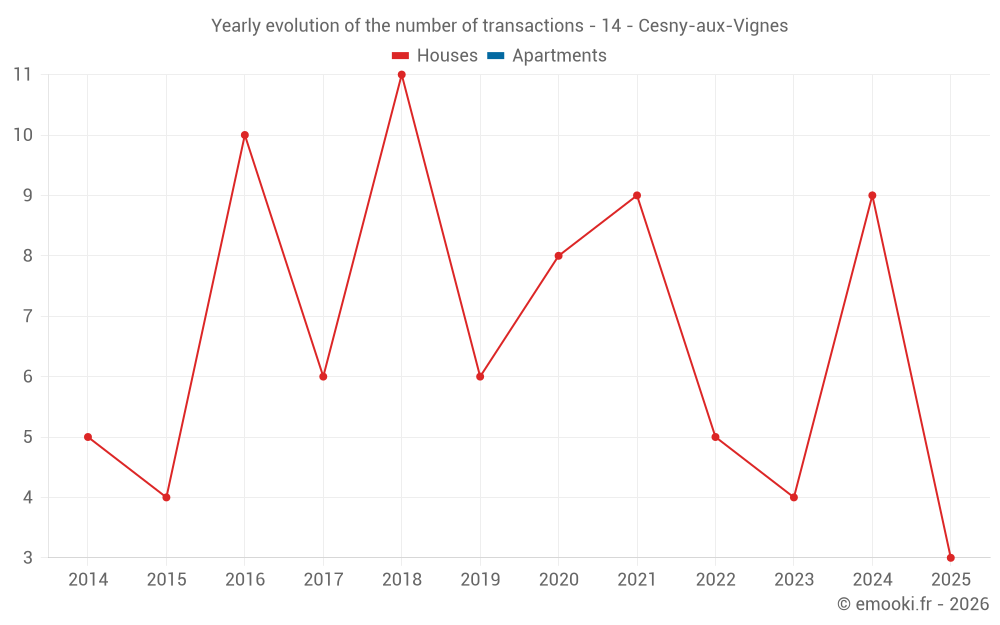 The median price on the 14 house transactions of the last 24 months in the municipality of Cesny-aux-Vignes was 2 316 € per square meter for a median property value of 180 500 €. Over this period, 60% of transactions were between 1 679 and 2 713 € per square meter (from the 2nd to the 8th deciles).