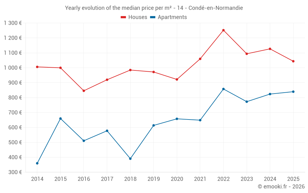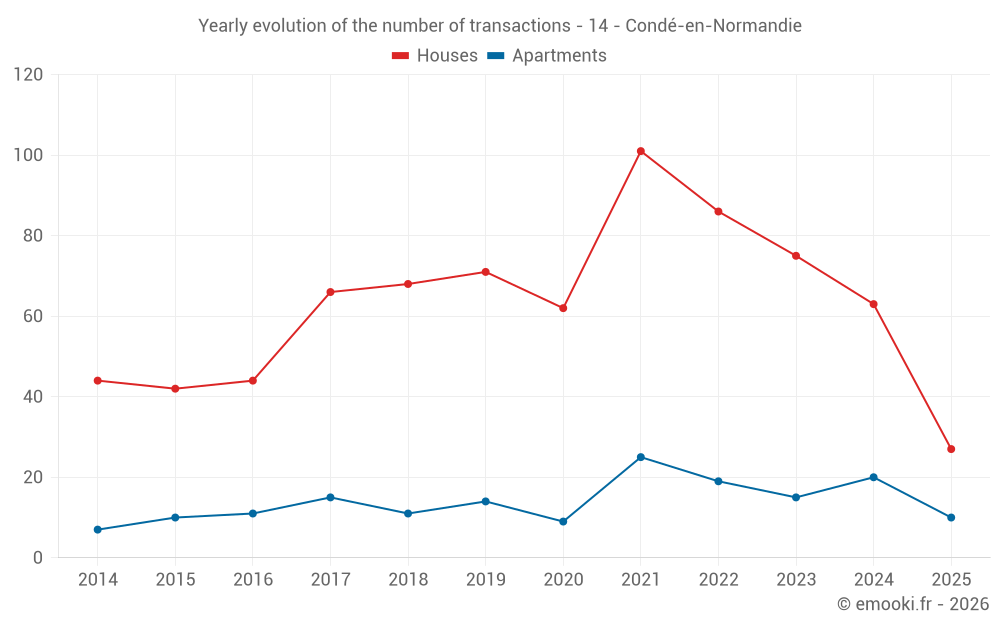 The median price on the 27 house transactions of the last 6 months in the municipality of Condé-en-Normandie was 1 044 € per square meter for a median property value of 100 000 €. Over this period, 60% of transactions were between 602 and 1 537 € per square meter (from the 2nd to the 8th deciles).