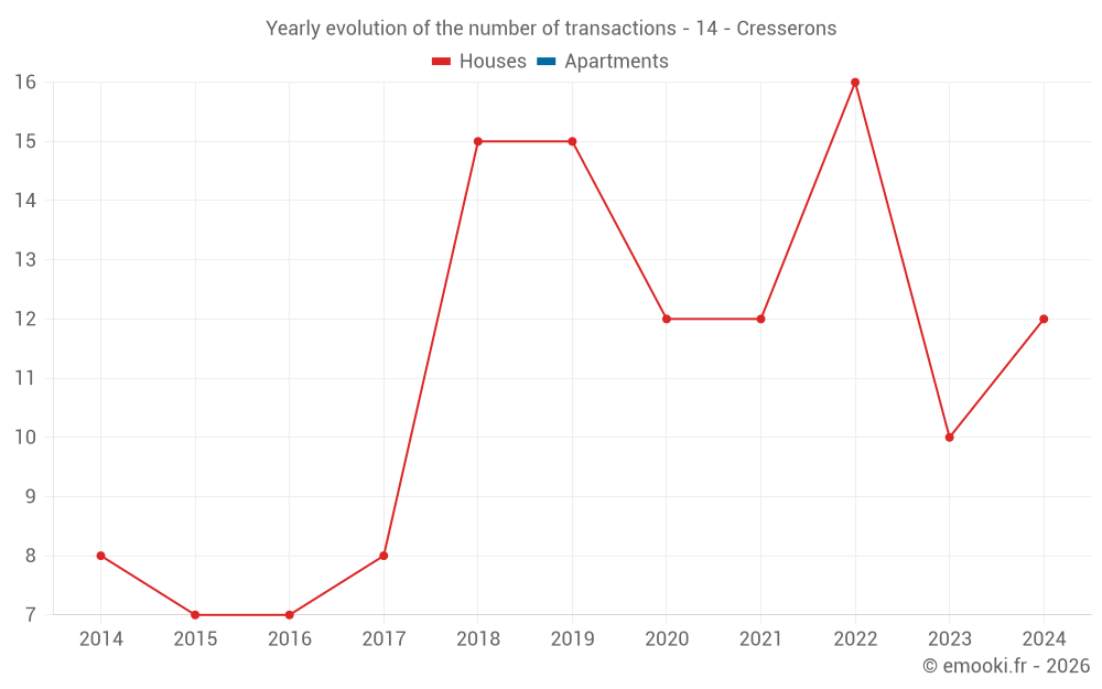 The median price on the 16 house transactions of the last 24 months in the municipality of Cresserons was 2 866 € per square meter for a median property value of 302 250 €. Over this period, 60% of transactions were between 2 652 and 3 763 € per square meter (from the 2nd to the 8th deciles).
