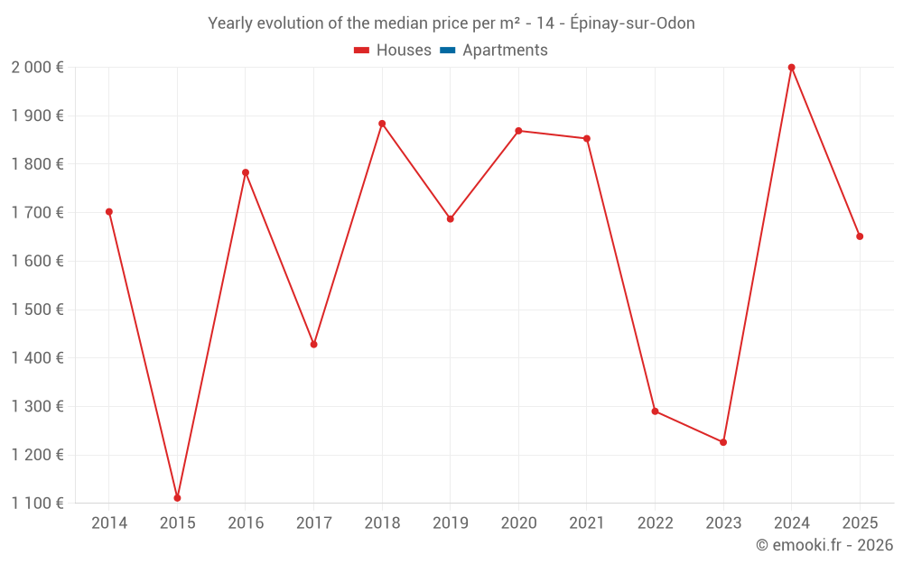 The median price on the 16 house transactions of the last 24 months in the municipality of Épinay-sur-Odon was 1 413 € per square meter for a median property value of 186 750 €. Over this period, 60% of transactions were between 787 and 2 118 € per square meter (from the 2nd to the 8th deciles).