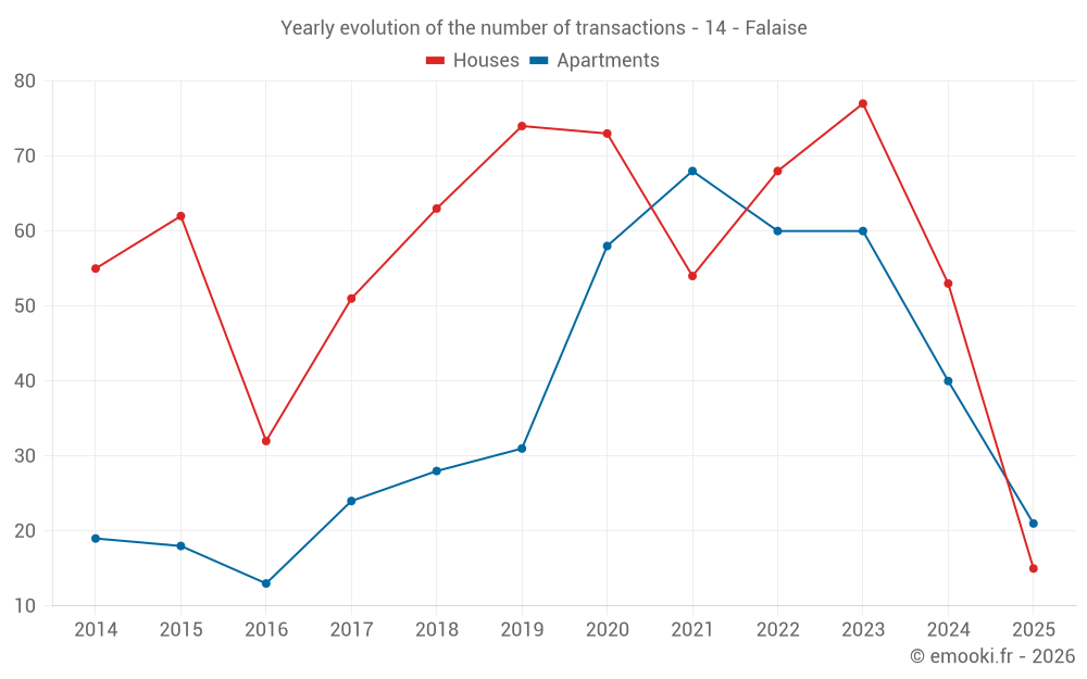 The median price on the 39 house transactions of the last 12 months in the municipality of Falaise was 1 824 € per square meter for a median property value of 172 000 €. Over this period, 60% of transactions were between 1 340 and 2 320 € per square meter (from the 2nd to the 8th deciles).