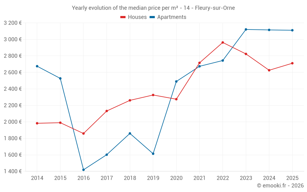 The median price on the 27 apartment transactions of the last 12 months in the municipality of Fleury-sur-Orne was 3 000 € per square meter for a median property value of 145 000 €. Over this period, 60% of transactions were between 2 672 and 3 633 € per square meter (from the 2nd to the 8th deciles).