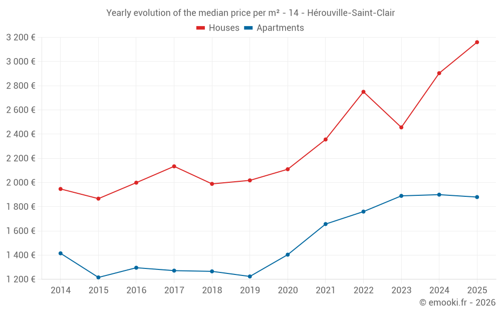 The median price on the 46 house transactions of the last 12 months in the municipality of Hérouville-Saint-Clair was 2 930 € per square meter for a median property value of 266 102 €. Over this period, 60% of transactions were between 2 304 and 3 340 € per square meter (from the 2nd to the 8th deciles).