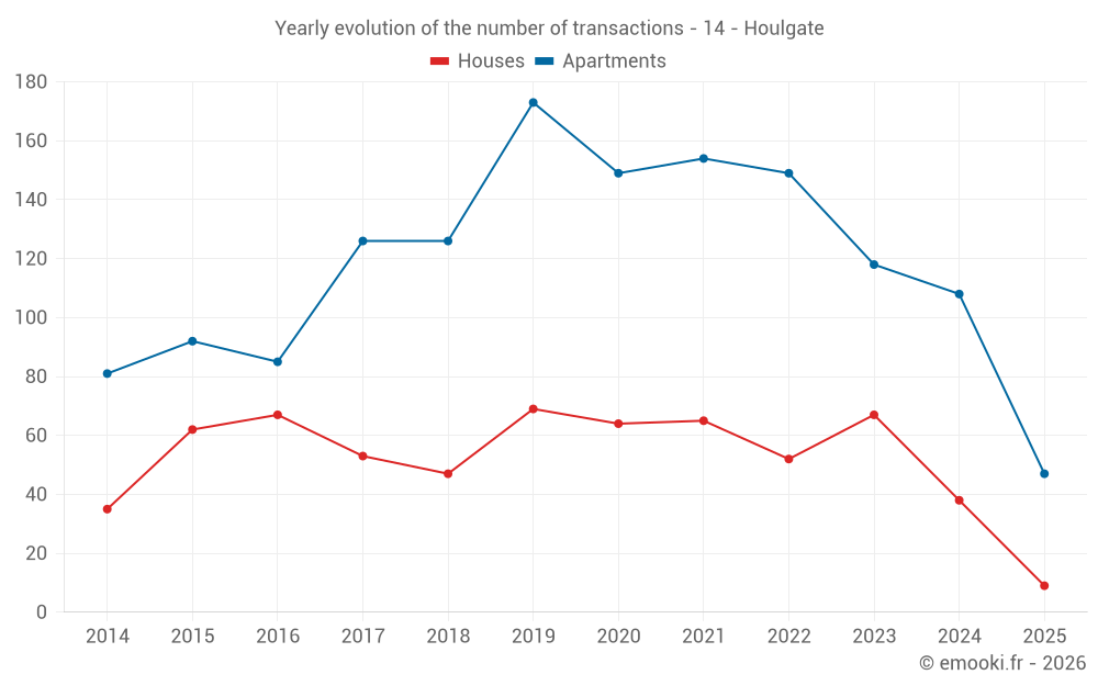 The median price on the 27 house transactions of the last 12 months in the municipality of Houlgate was 4 643 € per square meter for a median property value of 400 000 €. Over this period, 60% of transactions were between 3 301 and 5 467 € per square meter (from the 2nd to the 8th deciles).