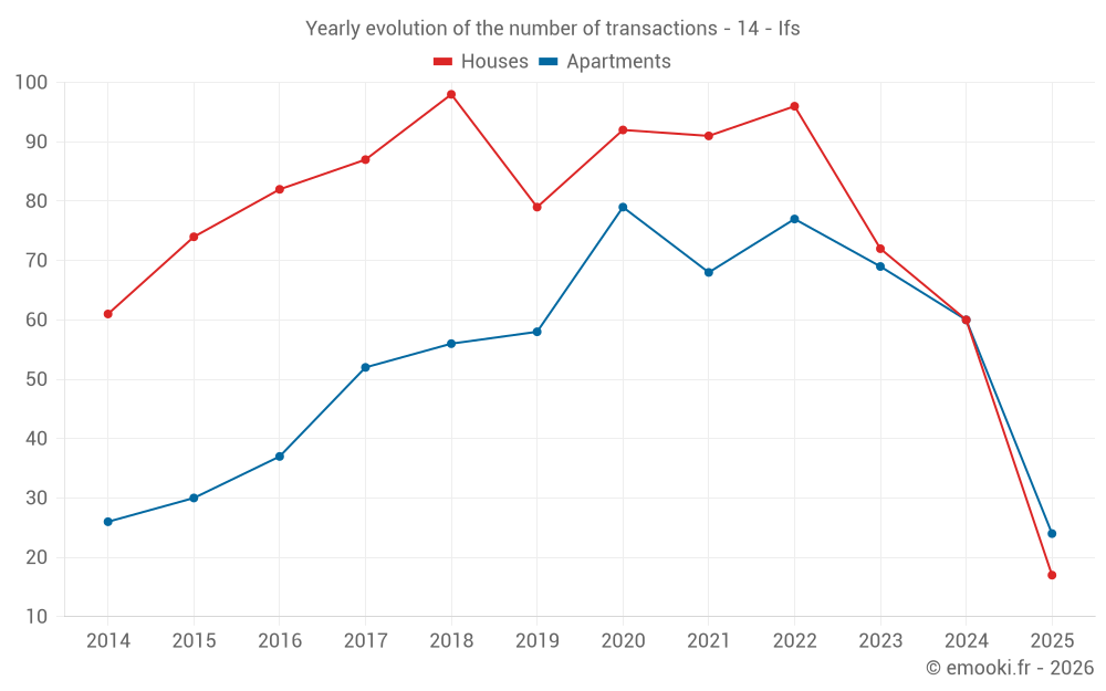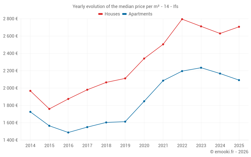 The median price on the 57 house transactions of the last 12 months in the municipality of Ifs was 2 609 € per square meter for a median property value of 240 000 €. Over this period, 60% of transactions were between 2 277 and 3 102 € per square meter (from the 2nd to the 8th deciles).