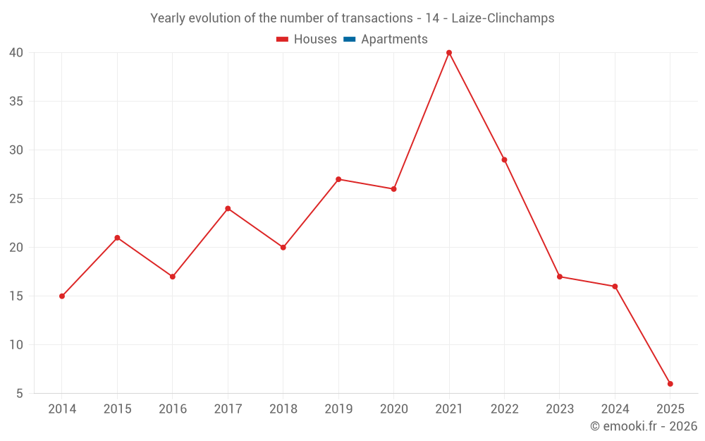 The median price on the 33 house transactions of the last 24 months in the municipality of Laize-Clinchamps was 2 289 € per square meter for a median property value of 238 850 €. Over this period, 60% of transactions were between 1 515 and 2 591 € per square meter (from the 2nd to the 8th deciles).