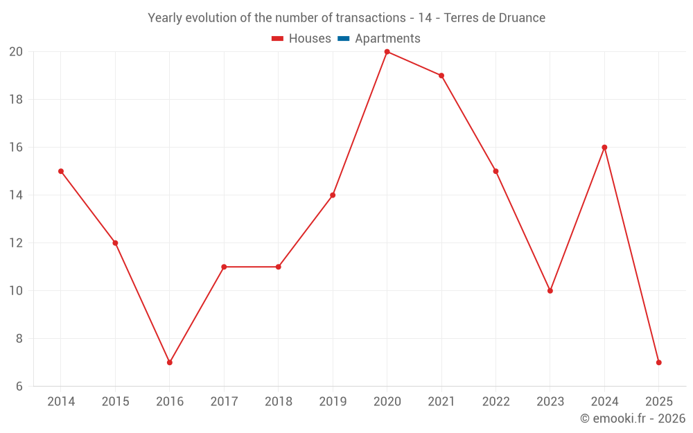 The median price on the 16 house transactions of the last 12 months in the municipality of Terres de Druance was 1 088 € per square meter for a median property value of 110 000 €. Over this period, 60% of transactions were between 753 and 1 424 € per square meter (from the 2nd to the 8th deciles).