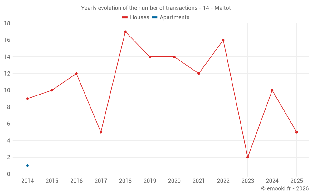 The median price on the 17 house transactions of the last 24 months in the municipality of Maltot was 2 706 € per square meter for a median property value of 273 000 €. Over this period, 60% of transactions were between 2 525 and 2 929 € per square meter (from the 2nd to the 8th deciles).